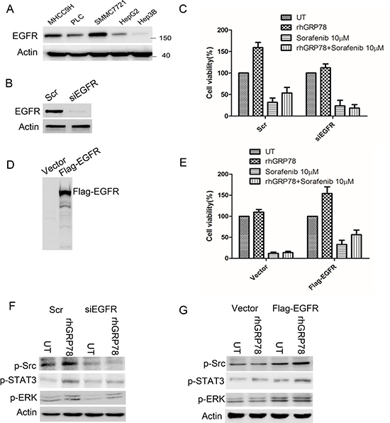 Figure 5: EGFR determines the response to sorafenib in HCC cells. (A) Western blot analysis of EGFR expression in a variety of HCC cell lines. (B) Western blot analysis of EGFR expression in SMMC7721 cells transfected with siEGFR. (C) MTT analysis of the effect of rhGRP78 on the sensitivity to sorafenib in EGFR knockdown SMMC7721 cells. The experiment was repeated three times in triplicate. The values were presented as mean ± SD. (D). Western blot analysis of EGFR expression in Hep3B cells transfected with Flag-EGFR. (E) MTT analysis of the effect of rhGRP78 on the sensitivity to sorafenib in Hep3B cells overexpressing EGFR. The experiment was repeated three times in triplicate. The values were presented as mean ± SD. (F) Western blot analysis of the phosphorylation of SRC and ERK in EGFR knockdown SMMC7721 cells. (G) Western blot analysis of the phosphorylation of SRC and ERK in cells overexpressing EGFR.