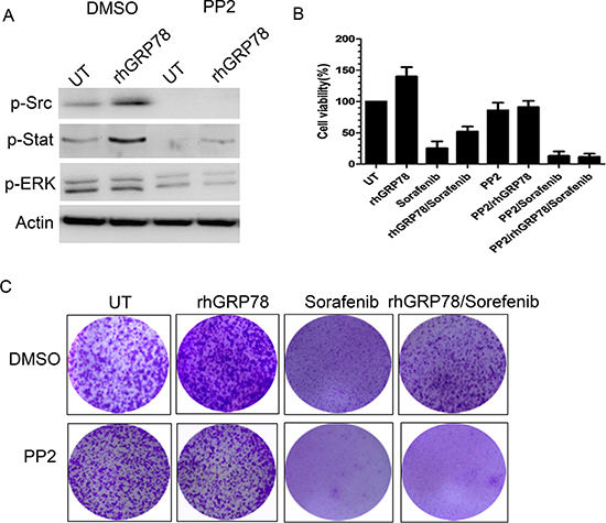 Furthermore, we investigate whether SRC enhanced the phosphorylation of STAT3 in HCC cells. To this end, serum starved SMMC7721 cells were pretreated with PP2, a SRC specific inhibitor, for 1h, followed by rhGRP78 treatment for 12 h in serum free condition. Western blot analysis revealed that treatment of SMMC7721 cells with PP2 resulted in an obvious inhibition in the phosphorylation of STAT3 induced by rhGRP78 (Figure 6A). At the same time, we examined whether inhibition of SRC could attenuate the resistance to sorafenib conferred by secreted GRP78. MTT assay revealed that pretreatment of SMMC7721 cells with PP2 caused a significant increase in the sensitivity to sorafenib in SMMC7721 cells treated with rhGRP78 (Figure 6B). Colony-formation assay also demonstrated that inhibition of SRC significantly increased the cytotoxic effect of sorafenib on rhGRP78 treated SMMC7721 cells (Figure 6C).