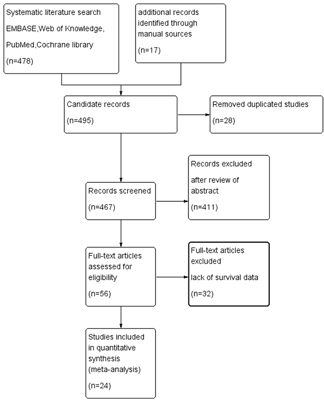 The initial search returned 495 studies (with 28 duplicate studies). After screening the abstracts, 411 irrelevant studies were excluded according to the criteria of inclusion and exclusion. Reviewers identified 56 potential studies for full-text review and 31 studies were eliminated due to inadequate data for meta-analysis. Finally, 25 studies were included in the current meta-analysis [7, 9, 10, 19–40]. The detail of the screening process was shown in Figure 1.