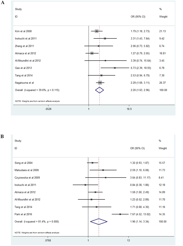 There were several limitations must be taken into account while interpreting the conclusions of the present meta analysis. First, high EGFR expression was defined according to different cut-off values in various studies, which might affect the stability of the conclusions in different studies. Second, different baseline characteristics, such as tumor stages, treatments, and races, might lead to clinical heterogeneity. Third, to reduce clinical heterogeneity, the studies with EGFR expression detected by Western blot (WB) or Polymerase Chain Reaction (PCR) were excluded from the present study, which might influence the clinical applicability. We recommend that the studies with EGFR expression detected by WB or PCR method should be included in future study to further explore the prognostic role of EGFR expression in GC patients. Fourth, the present meta analysis only provided evidences for correlation between high EGFR and clinicopathologic features, which could not be simply interpreted as causal relationship.