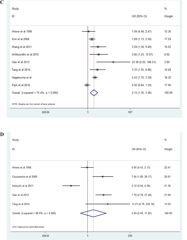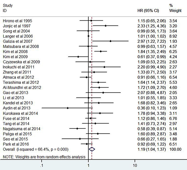 We detected significant heterogeneity in the current meta analysis. There might be some potential sources of heterogeneity such as cut-off values, tumor stages, treatments, and races. However, we did not find any significant source of heterogeneity using meta-regression analysis and subgroup analysis.