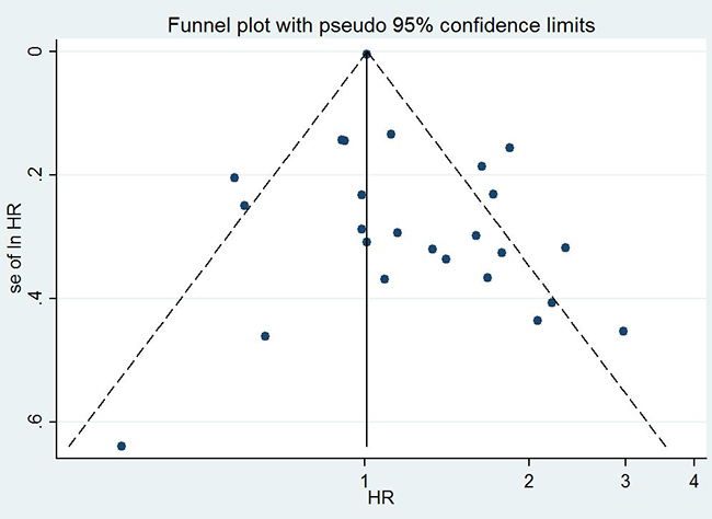 The statistical analysis was executed according to the proposals of the Meta-Analysis of Observational Studies in Epidemiology group (MOOSE) [13]. The HRs and 95% CIs were used to summary survival information. We directly obtained pooled HRs and 95% CIs if the survival data were reported in the text. While the HRs and 95% CIs were not directly reported in the text, the survival information were extracted from Kaplan-Meier curve and used to estimate HR. The heterogeneity was assessed by using I2 statistic, which was defined according to the Cochrane Handbook [14]: 0% to 40%, negligible heterogeneity; 30% to 60%, moderate heterogeneity; 50% to 90%, substantial heterogeneity; 75% to 100%, considerable heterogeneity. The subsequently meta-analysis was performed using random effect model with DerSimonian and Laird method [15], which applying the inverse of variance as a weighing factor. Meta-regression analyses with REstricted Maximum Likelihood (REML) method and subgroup analyses were performed to explore the sources of heterogeneity. Funnel plot, Begg's test [16], and Egger's test [17] were used to assess the publication bias. The contour-enhanced funnel plot with the trim-and-fill methodwas performed to determine whether or not funnel plot asymmetry was caused by publication bias [18]. P value<0.05 was considered statistically significant. The statistical analyses were performed by STATA version 12.0 software (Stata Corporation, College Station, Texas, USA).