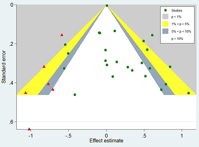 Publication bias is an important factor for interpretation of the conclusions. The funnel plot was asymmetry and the Egger’s test suggested that the existence of potential publication bias. The contour-enhanced funnel plot by using the trim-and-fill method was performed to explore the potential sources for the funnel plot asymmetry. There were 3 studies out of 6 added dummy studies lying in the areas with high statistical significance, meaning that the publication bias might not the only cause to the funnel plot asymmetry. The funnel plot asymmetry might be caused by the following factors such as language bias, location bias, citation bias, multiple publication bias, true heterogeneity, poor methodological quality of little sample studies, and selective reporting.