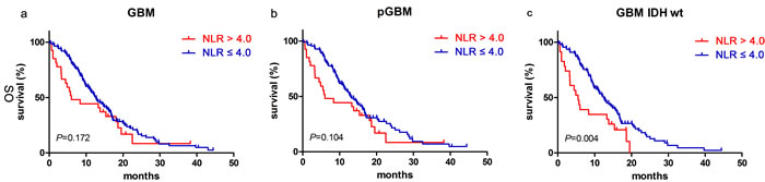 Figure 1: NLR predicted OS in glioblastomas. Kaplan-Meier method with log rank test for NLR in predicting OS for a. glioblastomas, b. pGBM and c. IDH wt GBM.