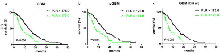 The median OS of 13.33 months (95% CI 11.25–15.41) for patients with PLR ≤ 175.0 was longer than the 7.00 months (95% CI 4.22–9.78) for patients with PLR > 175.0 (p=0.006, Figure 2a). PLR ≤ 175.0 was also associated with better clinical outcome in the pGBM group [14.27 months (95% CI 11.83–16.71) vs. 6.80 months (95% CI 3.57–10.03); p=0.014, Figure 2b] and the IDH-1R132H-wt group [13.00 months (95% CI 10.84–15.16) vs. 6.03 months (95% CI 3.38–7.68); p=0.002, Figure 2c].