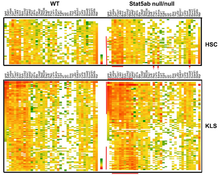 Figure 1: Transcriptional heterogeneity in Stat5 deficient LT-HSC and KLS cells analyzed by single cell PCR. Single cell PCR was performed twice using a Fluidigm 96.96 dynamic array with sorted LT-HSC or KLS cells from either wild-type or Stat5abnull/null fetal liver transplanted chimeric mice. The top heat map depicts all the single cells (23 cells each) and 39 genes analyzed with sorted Stat5 wild type and knockout LT-HSC (CD150+CD48-KLS) cells. Heat maps were created from Excel Pivot tables with conditional formatting (Excel 2010). Red/Orange represents a high level of expression (lower Ct) and green represents a lower level of expression (Higher Ct). White represents failure to detect. The bottom heat map shows KLS cells (46 cells for WT and 45 cells for Stat5abnull/null) that were from independent flow cytometric sorting from two different batches of fetal liver chimeric mice. Bone marrow cells were pooled from 2-3 chimeric mice. Any primer sets that failed to detect signal from 10 cells of the positive control were removed from analysis. The mean average of Ct values from the whole array was normalized to the same between arrays. Sub-population cells are bracketed by red lines or arrows.