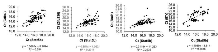 Figure 2: The correlation coefficient between Stat5b and the rest of the genes. Correlation was calculated using single cell PCR data from WT KLS cells. Pairs of genes with strong correlations were plotted with a linear regression trend line. The linear regression equation and R-squared value is displayed in each plot. Cdk4, Zfb236, Bmi1, and Il7r had the strongest associations with Stat5b.