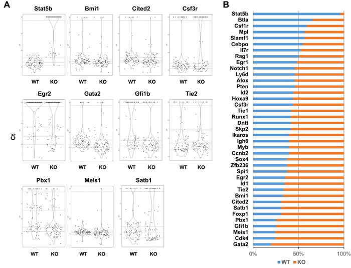 Figure 3: The majority of the key regulatory genes within the highest expressing KLS cells are overrepresented in the absence of Stat5. A. KLS were re-analyzed for genes with significant changes in expression based on the Mantel-Haenszel Chi-squared test with P value less than 0.05 (for details see Materials and Methods), and plotted on violin plots with R software. The y-axis for each violin plot varied depending on the relative expression level and the distribution between the highest and lowest expressing cells. The dotted lines separate data into five categories: The Ct with arbitrarily set value at 30 as a separate category with no or extremely low level expression. The remaining Ct values from each gene are categorized into 4 quartiles. B. The rank test was applied to each gene expression in Stat5 WT and KO KLS cells. The Ct value from each gene in Stat5 WT and KO single KLS cell was ranked from low to high. The highest expression (the top 25% of cells with low Ct value) for each gene was further checked for the distribution between WT and KO cells. Blue represents the percentage of WT KLS cells with the highest gene expression and orange represents the percentage of KO KLS cells with the highest gene expression.