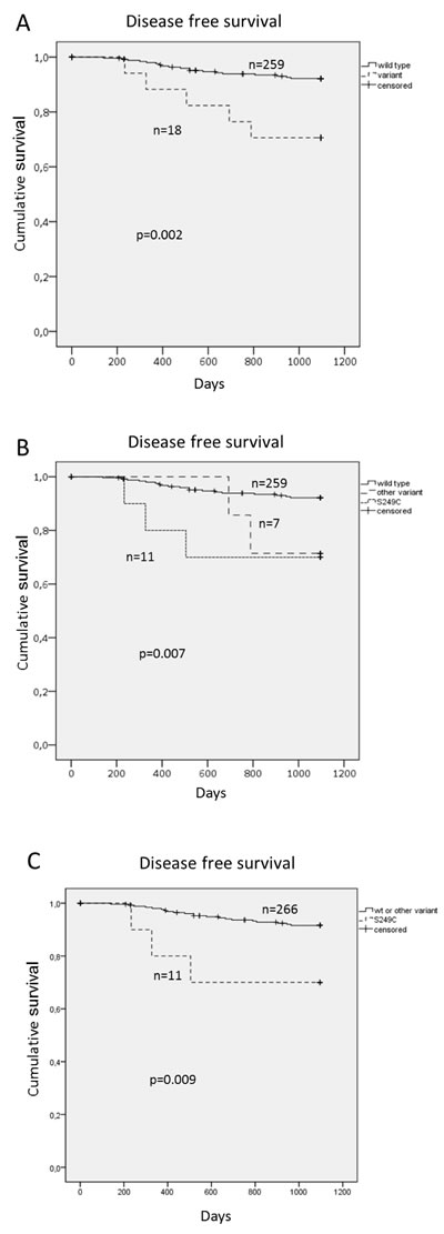 Of note, patients with HPV+ TSCC/BOTSCC with mutations in FGFR3 had a worse clinical outcome, depicted as 3-year disease free survival (DFS) (p = 0.002) (Figure 2A). Specific data on the FGFR3 mutations are presented in Supplementary Table S1. FGFR3 has previously been reported to be mutated in HPV+ HNSCC and the common specific variant of FGFR3, S249C, is a putative treatment target in urinary bladder cancer [31, 32]. This was also the most common FGFR3 variant in our study and was further investigated. Among the 19 HPV+ TSCC/BOTSCC patients treated with curative intent and with mutations in the FGFR3 gene, 11 carried the S249C variant. When HPV+ TSCC/BOTSCC cases were divided into those carrying the S249C variant, as compared to those with other FGFR3 variants and those with non-mutated FGFR3, patients with tumors carrying S249C had a significantly worse 3-year DFS (p = 0.009) (Figure 2B). When HPV+ TSCC/BOTSCC was stratified into three strata, those carrying the S249C variant, those with other FGFR3 variants and the rest of the cases, patients with tumors carrying S249C had a significantly shorter 3-year DFS (p = 0.007) (Figure 2C). Presence of FGFR3 mutations were also evaluated in relation to overall survival in HPV+TSCC/BOTSCC, but here statistical significance was not obtained (data not shown).