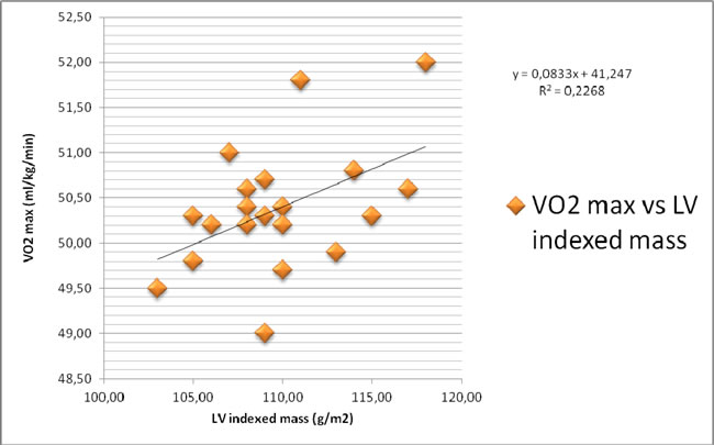 So we investigated main usual 2D parameters and then we have focused our attention on STE. LV mass (p=0.04) and EF (p=0.03) showed a weak relation with VO2max. Total number of training sessions/year were not similarly related to VO2max.