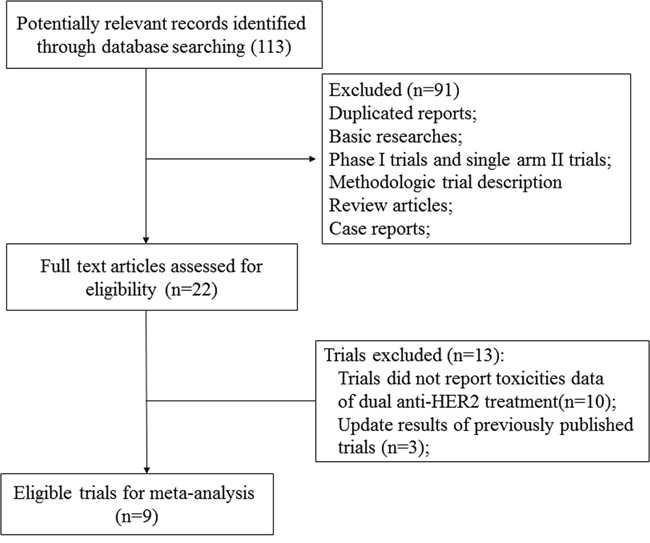 To be included in the meta-analysis, a study had to satisfy the following requirements: (1) patients with pathologically confirmed breast cancer; (2) randomized controlled trials comparing anti-HER2 monotherapy (lapatinib or trastuzumab or pertuzumab) versus dual HER2 blockade treatment with or without chemotherapy regardless of treatment settings; (3) available data regarding adverse outcomes of interest (grade ≥3 AEs of diarrhea, rash, liver toxicities and congestive heart failure (CHF), left ventricular ejection fraction (LVEF) decline less than 50% or a decrease of more than 10% from baseline, AEs lead to permanent treatment discontinuation and fatal adverse events) and sample size.