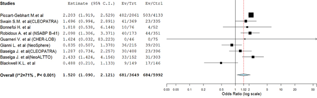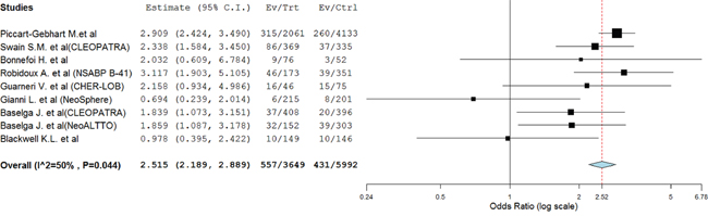 For the calculation of odds ratio (OR), patients assigned to dual anti-HER2 treatment were compared only with those assigned to anti-HER2 monotherapy in the same trial.