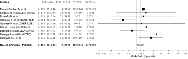 There were 89 CHF events was reported, with 42 in dual anti-HER2 arms and 47 in control arms. Our results found that dual anti-HER2 agents seemed to increase the risk of CHF using a fixed effect model (OR=1.46; 95% CI 0.94–2.26; P=0.09, Figure 3). Similar results were observed in subgroup analysis based on anti-HER2 treatment (Table 3).