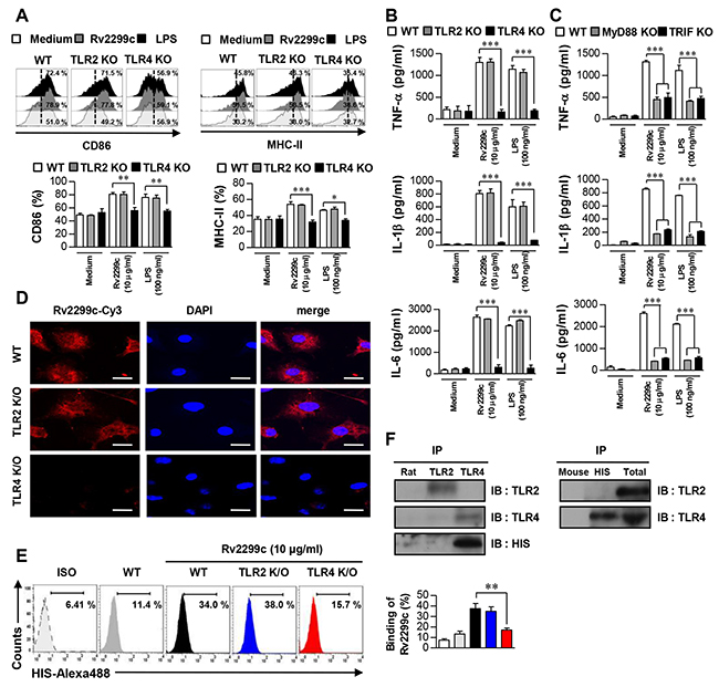 Figure 2: Rv2299c induces DC activation via TLR4. Bone marrow-derived DCs from WT, TLR2−/−, and TLR4−/− mice were treated with Rv2299c (10 μg/ml) or LPS (100 ng/ml) for 24 hr. A. Expression of CD86 and MHC class II was determined by staining and flow cytometry. Bar graphs show the percentages (mean ± SEM of three separate experiments) for each surface molecule on CD11c+ cells. B. and C. DCs derived from WT, TLR2−/−, or TLR4−/− and WT, MyD88−/−, or TRIF−/− mice were stimulated with Rv2299c or LPS for 24 hr and the produced cytokines were determined by an ELISA. D. Fluorescence intensity of the anti-His antibody bound to Rv2299c-treated DCs. DCs derived from WT, TLR2−/−, and TLR4−/− mice were treated with Rv2299c (10 μg/ml) for 1 hr, fixed, and stained with DAPI and a Cy3-conjugated anti-His antibody (Scale bar: 10 mm). E. DCs treated with Rv2299c for 1 hr and stained with an Alexa 488-conjugated anti-His mAb. Representative flow cytometry (left). The percentage of positive cells shown in each panel are also presented as mean ± SEM of three independent experiments (right). ISO: isotype control. F. DCs were treated with Rv2299c (10 μg/ml) for 6 hr. The cells were harvested, and cell lysates were immunoprecipitated (IP) with an anti-rat IgG, anti-mouse IgG, anti-His, anti-TLR2, or anti-TLR4 Ab; then proteins were visualized by immunoblotting (IB) with anti-His, anti-TLR2, or anti-TLR4 Abs. Totals are shown as mean total cell lysates (input). All data are expressed as mean ± SD (n = 3). One representative data point of three experiments is shown; *p < 0.05, **p < 0.01 and ***p < 0.001 for different treatments compared to Rv2299c- or LPS-treated WT DCs.