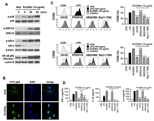 Figure 3: Involvement of the ERK1/2 and p38 but not JNK pathways in Rv2299c protein-induced maturation of DCs. A. Protein production by DCs treated with Rv2299c for indicated periods was analyzed by immunoblotting using each specific Ab: to phospho-p38 (p-p38), p38, phospho-ERK1/2 (p-ERK1/2), phospho-IκB-a, IκB-a, and p65 NF-κB. B. Effects of Rv2299c on cellular localization of the p65 subunit of NF-κB in DCs. DCs were plated in covered glass chamber slides and treated with Rv2299c for 1 hr, and immunoreactivity of the p65 subunit of NF-κB in cells was determined by immunofluorescence. C. and D. DCs were pretreated with pharmacological inhibitors of p38 (SB203580, 20 μM), ERK1/2 (U0126, 10 μM), JNK (SP600125, 20 μM), Bay11-7082 (5 μM), or DMSO (vehicle control) for 1 hr prior to treatment with 10 mg/ml Rv2299c protein for 24 hr. The expression of CD80 and CD86 was analyzed by flow cytometry (C). Bar graphs show the percentages (mean ± SEM of three separate experiments) for each surface molecule on CD11c+ cells. The amounts of TNF-α, IL-6, and IL-1β in the culture medium were measured by ELISAs (D). The mean ± SEM are shown for three independent experiments; *p < 0.05, **p < 0.01, or ***p < 0.001 for inhibitor treatments compared to Rv2299c-treated controls.
