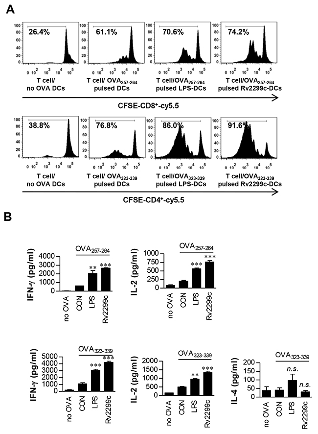 Figure 4: Rv2299c protein-treated DCs induce T-cell proliferation. A. Transgenic OVA-specific CD8+ T cells and transgenic OVA-specific CD4+ T cells were isolated, stained with CFSE, and cocultured for 96 hr with DCs treated with Rv2299c (10 μg/ml) or LPS (100 ng/ml), then pulsed with OVA257–264 (1 μg/ml) for OVA-specific CD8+ T cells or OVA323–339 (1 μg/ml) for OVA-specific CD4+ T cells, respectively. T cells only and T cells cocultured with untreated DCs served as controls. The proliferation of OT-I+ and OT-II+ T cells was then assessed by flow cytometry. B. The culture supernatants harvested after 24 hr and IFN-γ, IL-2, and IL-4 were assayed by ELISA. The mean ± SEM is shown for three independent experiments; *p < 0.05 for treatments when compared to the appropriate controls (T cell/OVA257–264 pulsed DCs or T cell/OVA323–339 pulsed DCs). n.s.: no significant difference.