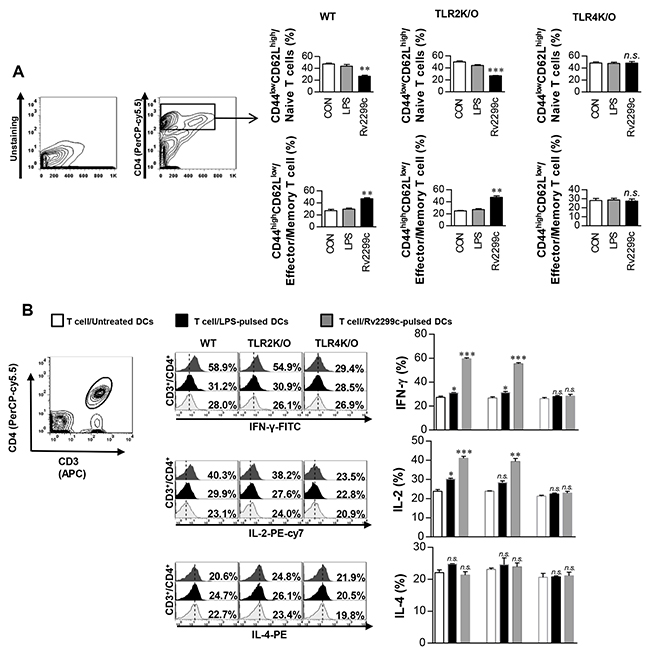 Figure 5: Rv2299c protein-treated DCs induce expansion of effector/memory T-cell population. DCs from WT, TLR2−/−, and TLR4−/− mice were treated with Rv2299c (10 μg/ml) or LPS (100 ng/ml), and then cocultured for 3 d with T cells from Mtb-infected mice at DC to T cell ratios of 1:10. Splenocytes were stained with anti-CD4, anti-CD62L, and anti-CD44 mAbs. A. A histogram is shown for gating of the labeled T cells. Bar graphs show CD62LlowCD44high T cells or CD62LhighCD44low T-cell populations among the spleen cells. B. Intracellular IFN-γ, IL-2, or IL-4 expression in CD3+/CD4+ T cells cocultured with untreated DCs, Rv2299c-treated DCs, or LPS-stimulated DCs. The percentages of CD3+/CD4+ T cells among all T cells are indicated in the top right corner. Mean ± SEM for three independent experiments is shown; **p < 0.01 or ***p < 0.001 for treatments compared to untreated DCs. n.s.: no significant difference.