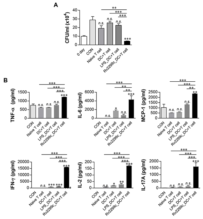Figure 6: T cells activated by Rv2299c-maturated DCs inhibit intracellular Mtb growth. Naïve T cells or T cells activated by unstimulated DCs, LPS-stimulated DCs, or Rv2299c-stimulated DCs at a DC:T cell ratio of 1:10 for 3 d were cocultured with BMDMs infected with Mtb. A. Intracellular Mtb growth in BMDMs was determined at time point 0 (0 day) and 3 d after coculturing with T cells or without T cells (control). B. The cytokine levels in culture supernatants were measured by ELISA. The data shown are the mean values ± SD (n = 3); *p < 0.05, **p < 0.01, or ***p < 0.001 for BMDMs cocultured with T cells compared to control BMDMs. n.s.: no significant difference.