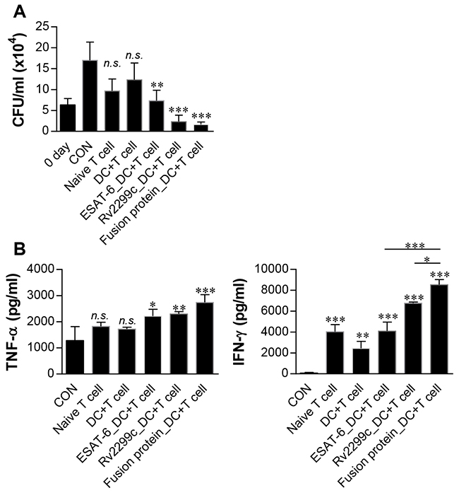 Figure 8: Inhibition of intracellular Mtb growth by T cells activated with Rv2299c-ESAT-6 fusion protein-maturated DCs. Naïve T cells or T cells activated by unstimulated DCs, ESAT-6-stimulated DCs, Rv2299c-stimulated DCs, or the fusion protein-stimulated DCs at a DC:T cell ratio of 1:10 for 3 d were cocultured with BMDMs infected with Mtb. Intracellular Mtb growth in BMDMs A. and the cytokine levels B. were determined as in Figure 6. The data shown are mean values ± SD (n = 3); *p < 0.05, **p < 0.01, or ***p < 0.001 for BMDMs cocultured with T cells compared to control BMDMs. n.s.: no significant difference.