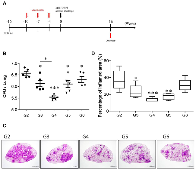Figure 9: CFU counts for each group and histological analysis of representative lung lobes. A. A schematic diagram of the experimental design. B. Differences in the bacterial burden among the mice immunized with BCG alone, protein alone, or the BCG/Rv2299c-ESAT-6 fusion protein and those treated with the adjuvant control (MPL-DDA alone) at 16 weeks after a challenge with Mtb HN878 are shown (n = 5 animals/group). C. Lung sections from each immunized mouse were stained with H&E at 16 weeks after challenge with Mtb HN878. D. The percentage of the inflamed area from a lung section; *p < 0.05, **p < 0.01, and ***p < 0.001 compared with the MPL/DDA-alone group. Group 1 (G1): infection control, G2: MPL/DDA control, G3: BCG alone, G4: BCG/Rv2299c-ESAT-6 fusion protein- MPL/DDA, G5: the Rv2299c-ESAT-6 fusion protein- MPL/DDA, G6: ESAT-6- MPL/DDA.