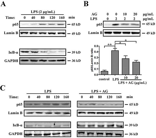 Figure 6: AG inhibits LPS-induced NF-κB activation. A. A549 cells were cultured with 2 μg/mL LPS for 8 h. Nuclear proteins were extracted and subjected to Western blotting for p65 detection. Lamin B was used as loading control. Additionally, the whole cell extracts with the same treatment were prepared and analyzed for IκBα expression. GAPDH was used as loading control. B. A549 cells were cultured with 2 μg/mL LPS in the absence and presence of 10-20 μg/mL AG for 8 h. Nuclear proteins were extracted and subjected to Western blotting for p65 detection. Lamin B was used as loading control. Band intensity was quantified by Image J software. Data are representative of three independent experiments. *p < 0.05, **p < 0.01. C. A549 cells were cultured with 2 μg/mL LPS in the absence and presence of 10 μg/mL AG for the indicated time. Nuclear proteins were extracted and subjected to Western blotting for p65 detection. Lamin B was used as loading control. Additionally, the whole cell extracts with the same treatment were prepared and analyzed for IκBα expression. GAPDH was used as loading control.