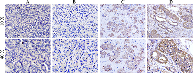 Figure 1: LDHA is associated with the progression of pancreatic cancers. Immunohistochemical staining for LDHA was performed in pancreatic cancer. A. The para-tumor tissue exhibited low LDHA staining negative (0), B. weak (1+), C. moderate (2+) and D. strong (3+)