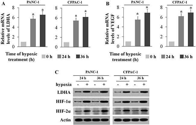 In the present study, we analyzed 244 PC specimens and adjacent normal tissues and found that the expression of LDHA was elevated in PC significantly. In addition, the expression of LDHA was closely associated with the development and progression of PC. Then, we treated PANC-1 and CFPAC-1 cells under the hypoxic condition (0.1% O2) and found that LDHA was over-expressed at both mRNA and protein levels, indicating that hypoxia induced the expression of LDHA in human PC cell lines.