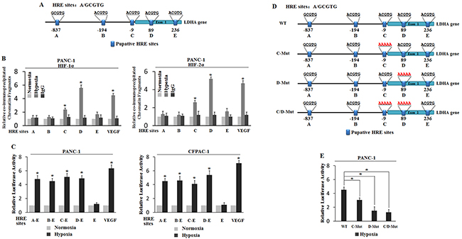 Figure 3: Hypoxia transactivates hypoxia-responsive elements (HREs) in the LDHA promoter through HIF-1α and HIF-2α. A. The human LDHA gene contains 5 putative HREs in its promoter region. B. Both HIF-1α and HIF-2α bind to the HRE-D site under the hypoxic condition in PANC-1 cells as determined by ChIP assays. Cells were cultured under the hypoxic or normoxic condition for 36 h before assays. The HRE site in the VEGF promoter serves as a positive control. The amount of DNA fragments pulled down was determined by RT-PCR. C. Hypoxia activated the luciferase activity of reporter vectors containing HRE-D sites in the LDHA promoter. PANC-1 and CFPAC-1 cells were transfected with the luciferase reporter vectors, and then subjected to hypoxic or normoxic treatment for 36 h before measuring luciferase activities. Luciferase reporter vector containing the HRE site in the VEGF promoter was included as a positive control. D. Mutant HER C and HER D to 5’-AAAAA-3’. E. Luciferase activity after HER C and HER D mutation. Data are presented as mean ± SD (n = 3). *: p < 0.01 (Student’s t-test).