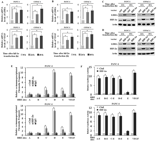 To investigate whether both HIF-1α and HIF-2α could active the LDHA expression level, PANC-1 and CFPAC-1 cells were transfected with the plasmids expressing HIF-1α (pcDNA3.1-HA-HIF2α) and HIF-2α (pcDNA3.1-HA-HIF1α). The ectopic expression of either HIF-1α or HIF-2α clearly induced VEGF mRNA expression (Figure 4A and 4B). Ectopic HIF-1α and HIF-2α significant increased LDHA expression at both mRNA and protein levels (Figure 4A and 4B). The ectopic HIF-1α and HIF-2α expression in cells was confirmed by Western-blot assays (Figure 4C and 4D). Furthermore, the degree of pull-down of chromatin fragments containing HREs in the LDHA promoter by HIF-1α and HIF-2α was determined by ChIP assays in PANC-1 and CFPAC-1 cells. As shown in Figure 4E, chromatin fragments containing HRE D was co-immunoprecipitated with the HIF-1α or HIF-2α. These observations clearly showed that HIF-1α and HIF-2α interacted with HRE-D in the LDHA promoter (Figure 4E). In addition, PANC-1 and CFPAC-1 cells were co-transfected with pcDNA3.1-HA-HIF1α or pcDNA3.1-HA-HIF2α and the pGL3 reporter plasmids containing HREs in the LDHA promoter. Notably, ectopic HIF-1α or HIF-2α expression obviously trans-activated the reporter plasmids containing HRE A-E, HRE B-E, HRE C-E and HRE D-E, but had a minimal effect on the reporter plasmids containing HRE-E (Figure 4F). Collectively, these results clearly showed that HIF-1α and HIF-2α interacted with HRE-D to induce LDHA expression.