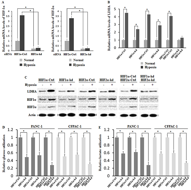 In addition, we investigated the roles of HIF-1α and HIF-2α in regulating aerobic glycolysis via LDHA by analyzing the glucose utilization and lactate production after HIF knockdown in PANC-1 and CFPAC-1. It was found that knockdown of HIF-1α or HIF-2α in PANC-1 and CFPAC-1 significantly decreased glucose utilization and lactate production induced by hypoxia (Figure 5D and 5E). Furthermore, knockdown of HIF-1α and HIF-2α in PANC-1 and CFPAC-1 almost reversed the effect of glucose utilization and lactate production induced by hypoxia (Figure 5D and 5E).