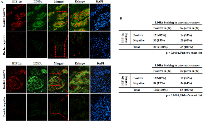 Figure 6: HIF-1α and HIF-2α over-expression is associated with LDHA over-expression in human pancreatic cancer specimens. HIF-1α, HIF-2α and LDHA protein levels were determined by immunofluorescence staining in 244 cases of human pancreatic cancer specimens. A. Representative IFC staining results for HIF-1α and LDHA double positive (upper panels) or negative (lower panels) are shown. B. HIF-1α overexpression was associated with LDHA over-expression in human pancreatic cancer (p < 0.0001, Fisher exact test). C. Representative IFC staining results for HIF-2α and LDHA double positive (upper panels) or negative (lower panels) are shown. D. HIF-2α over-expression was associated with LDHA over-xpression in human pancreatic cancer (p < 0.0001, Fisher exact test).
