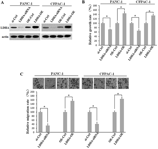 To examine the effect of LDHA on PC cells, PANC-1 and CFPAC-1 cells were transfected with pcDNA3.1-HA-LDHA or siRNA. Western blot analysis was applied to determine the expression of LDHA (Figure 7A). Then, CCK8 assay was performed to observe PC cell growth after alteration of the LDHA expression. The results showed that LDHA over-expression promoted PC cell growth, while knocking down the expression of LDHA inhibited cell growth markedly (Figure 7B). Further Transwell migration assay showed that silencing the expression of LDHA inhibited PC cell growth, and LDHA over-expression promoted cells migration (Figure 7C). These result showed that LDHA played an oncogenic role in PC.