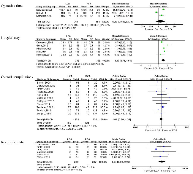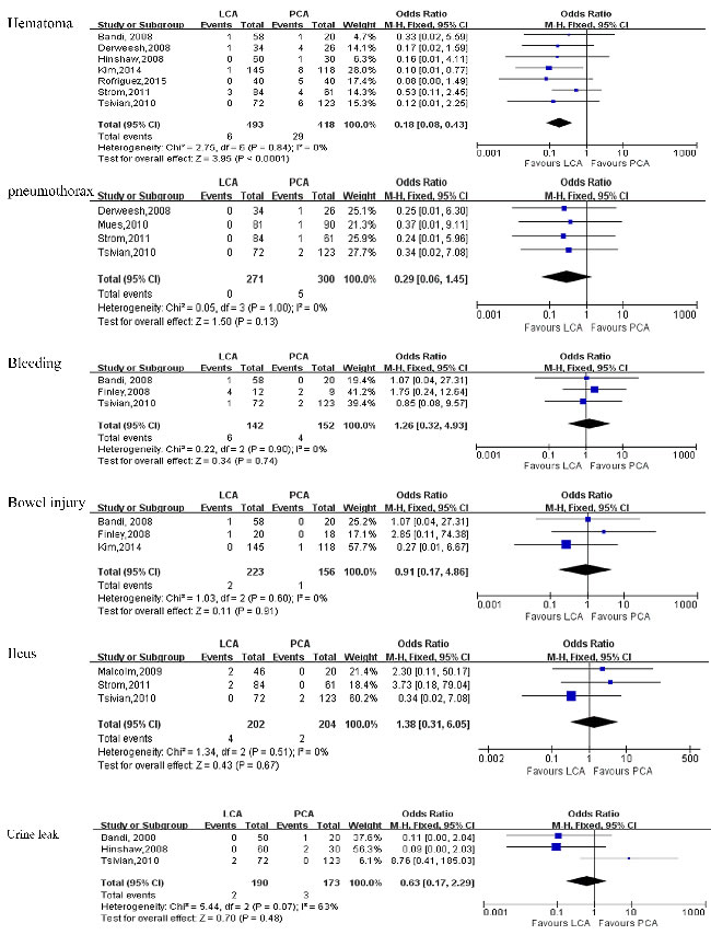 Nevertheless, Our meta-analysis compared LCA with PCA for treatment of SRMs was performed with adequate studies available for analysis. We used all available variables from included studies, including demographic and clinical characteristics, operative time, overall complications and oncological outcomes, to compare LCA with PCA for SRMs and to assess the evidence of the included literature with strict criteria. Here, our meta-analysis maybe provide up to date conclusions for the advantages and disadvantages of two approaches for treatment of SMRs.