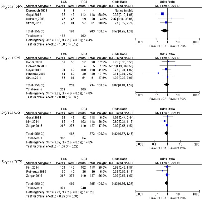 Pooling data of five [8, 9, 11, 13, 18] and seven [6, 8, 9, 11, 12, 14, 18] studies reported pathologic outcomes and local recurrence, respectively. The forest plot indicated that there was no statistical difference in term of postoperative pathologic outcomes (malignancy: OR: 1.21; 95% CI: 0.24 to 6.22; P = 0.82; benign: OR: 0.77; 95% CI: 0.16 to 3.74; P = 0.74)(Table 5, Supplementary Figure S3) and recurrence rate(OR: 0.95; 95% CI: 0.65 to 1.40; P = 0.81) (Figure 4). And there were also no statistical differences between PCA and LCA in term of 3-year disease-free survival(DFS)(OR: 0.57; 95% CI: 0.25 to 1.33; P = 0.19), 3-year overall survival(OS) (OR: 0.87; 95% CI: 0.48 to 1.55; P = 0.63), 5-year OS(OR: 0.82; 95% CI: 0.57 to 1.18; P = 0.29), 5-year recurrence-free survival(RFS)(OR: 0.83; 95% CI: 0.56 to 1.22; P = 0.34) (Figure 4, Table 5).