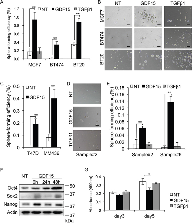 Figure 1: GDF15, but not TGFβ, efficiently induces tumor sphere formation in breast cancer cells. A. Tumor sphere assay of cell lines treated with GDF15 (200 ng/mL) or TGFβ1 (200 ng/mL). NT, not treated. n=4. **P < 0.01. B. Representative images of tumor spheres observed in (A). NT, not treated. Scale bar: 100 μm. C. Tumor sphere assay of cell lines treated with GDF15 (200 ng/mL). NT, not treated. n = 4, **P < 0.01. D. Representative images of tumor spheres derived from clinical sample #2, treated with GDF15 (200 ng/mL) or TGFβ1 (200 ng/mL). NT, not treated. Scale bar: 100 μm. E. The number of spheres in (D) and clinical sample #6 was counted and the percentage of sphere-forming efficiency was recorded. NT, not treated. n=4. **P < 0.01. F. Immunoblotting analysis of Oct4, Sox2, and Nanog expression in MCF7 cells treated with GDF15 (200 ng/mL). NT, not treated. Actin was used as a loading control. G. MTT assay using MCF7 cells. Cells were seeded to a 96-well plate and starved overnight prior to treatment with GDF15 (200 ng/mL) or TGFβ1 (200 ng/mL). The data was recorded at the indicated time. n=3. *P < 0.05.