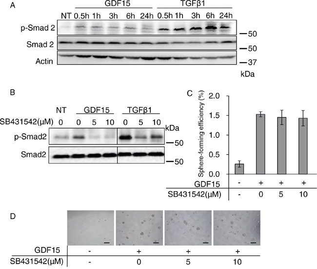 Figure 2: Activation of the canonical Smad pathway is not required for GDF15-induced tumor sphere formation. A. Immunoblotting analysis of phosphorylated Smad2 (p-Smad2) and Smad2 expression in MCF7 cells treated with GDF15 (200 ng/mL) or TGFβ1 (200 ng/mL). NT, not treated. Actin was used as a loading control. B. Immunoblotting analysis of p-Smad2 and Smad2 expression in MCF7 cells. An indicated concentration of SB431542 was applied to the cells 60 minutes prior to treatment with GDF15 (200 ng/mL) or TGFβ1 (200 ng/mL). Cell lysates were collected 30 minutes after treatment with each ligand. NT, not treated. C. Tumor sphere assay of GDF15-treated (200 ng/mL) MCF7 cells in presence of the indicated concentrations of SB431542. n=4. D. Representative images of (C). Scale bar: 100 μm.
