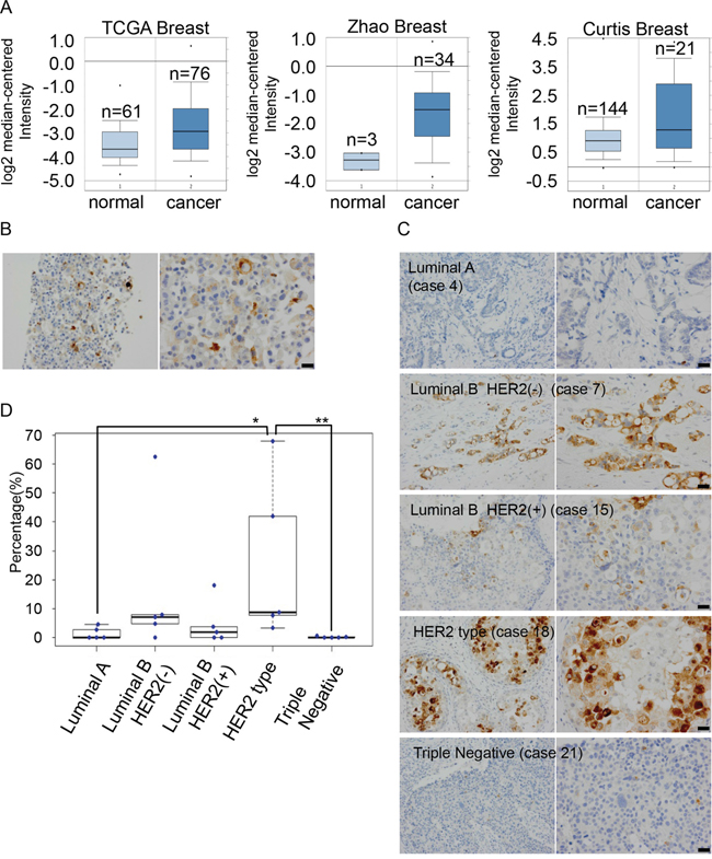 Figure 5: Expression levels of GDF15 are heterogeneous among cancer cells in MCF7 cells and human breast cancer tissues. A. Analysis of the expression levels of GDF15 transcripts in Oncomine database. B. Immunohistochemical staining of GDF15 in MCF7 cells in paraffin blocks using an anti-GDF15 antibody. Left, original magnification 200x. Right, scale bar: 20 μm. C. Immunohistochemical staining of GDF15 in various subtypes of breast cancer tissues. Left, original magnification 400x. Right, scale bar: 20 μm. D. Box plots of GDF15 expression among 25 clinical breast cancer tissues that include 5 cases in each subtype. **P < 0.01, *P < 0.05.