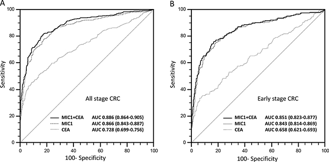 Figure 2: The diagnostic performance of serum MIC-1 and its combination with CEA for CRC. A. AUROC of serum MIC-1 was higher than that of CEA (P<0.001), and combination of MIC-1 and CEA would enhance the diagnostic performance significantly (P<0.001). B. The efficacy of serum MIC-1 in the detection of early stage CRC is significantly higher than CEA. ROC curve analysis showed the combination use of serum MIC-1 and serum CEA for discriminating early stage CRC will be valued in the screening of CRC.