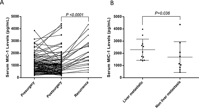 Figure 3: The value of serum MIC-1 in assessment of therapy response and surveillance of CRC recurrence after curative resection. A. The level of serum MIC-1 in CRC patients before surgery was compared with that of one month after surgical removal of primary tumors (n = 106). And in 20 patients with documented CRC recurrence, the level of serum MIC-1 were significantly elevated (median: 841.2 pg/mL vs 1747.0 pg/mL, mean + SD: 1017+832.1 pg/mL vs 1902+953.5 pg/mL; p<0.001). B. The level of serum MIC-1 in the patients with liver metastasis was compared with non-liver metastasis at the presence of tumor recurrence in 20 relapse patients. More highly elevated levels of serum MIC-1 was occurred 100% among 11 patients with liver metastasis, compared with MIC-1 levels in patients with non-liver metastasis (n=9).