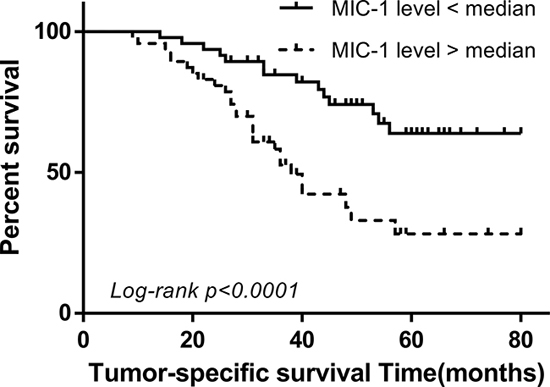 Figure 4: The value of serum MIC-1 in the prediction of CRC prognosis. Tumor-specific survival curves were prepared and analyzed between two divided groups according to the median levels of serum MIC-1 in patients before treatment (average, 43 months; range, 9–80 months; n=94). Patients with higher serum MIC-1 had a trend to poorer tumor-specific survival (median survival time: 34 vs 50 months, P<0.0001).