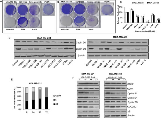 Figure 1: Effect of VNLG-152 on anchorage-dependent growth and cell cycle distribution. MDA-MB-231 (A) and MDA-MB-468 (B) cells were treated with VNLG-152, ATRA, 4-HPR, VN/14-1 and Mnk inhibitor (10 µmol/L) for 14 days. Colonies were fixed with methanol and stained with crystal violet. (C) Data represents the mean ± S.E from three independent experiments. *, P< 0.01; ♣, P<0.001 compared with vehicle treated control. (D) MDA-MB-231 and MDA-MB-468 cells were treated with indicated compound 15 µmol/L for 24 h. Total cell lysates were separated by SDS-PAGE and probed with cyclin D1 and D3 antibodies. (E) MDA-MB-231 cells were treated with VNLG-152 (2 µmol/L) for indicated time period, stained with PI and analysed with a FACScalibur flow cytometer. (F) Western blotting for cell cycle related proteins. Vehicle treated cells were included as a control and all blots were reprobed for β-actin for equal protein loading and transfer.