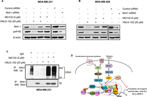 Figure 5: VNLG-152 induced degradation/polyubiquitination of Mnk protein and schematic model of MNK mediated eIF4E activation and inhibition by RAMBA retinamides (VNLG-152). MDA-MB-231 (A) and MDA-MB-468 (B) cells were treated with 20 µmol/L of VNLG-152, 5 μmol/L of MG-132, and combinations for 24 h. Mnk protein was immunoprecipitated with Mnk antibody (mouse) and the precipitated protein was subjected to western blot analysis with anti-ubiquitin antibody (Ub) (C, upper panel). The same blot was used to detect Mnk protein with anti-Mnk (rabbit) antibody after stripping (C, lower panel). Knockdown of Mnk1 by transfection with siRNA against (Mnk1) or its scramble control blocks eIF4E phosphorylation in MDA-MB-231 (A) and MDA-MB-468 (B) cells. All blots were reprobed with β-actin for equal protein loading and transfer. The data are representatives of two independent experiments. D: Activation of Ras/Erk pathway or p38 MAPK downstream of cytokine or stress stimuli results in activation of Mnk1 via phosphorylation. Activated Mnk subsequently binds to eIF4G and phosphorylates eIF4E within the eIF4F complex, resulting in the translation of certain mRNAs vital for oncogenic transformation. Conversely, PP2A can directly dephosphorylate Mnk and eIF4E proteins, leading to increased association of eIF4E with 4E-BP1 protein and reduced eIF4E translational machinery. RAMBA retinamides exert their inhibitory mode of action by inducing Mnk1 degradation subsequently reducing eIF4E phosphorylation and eIF4E driven cap dependent mRNA translation.