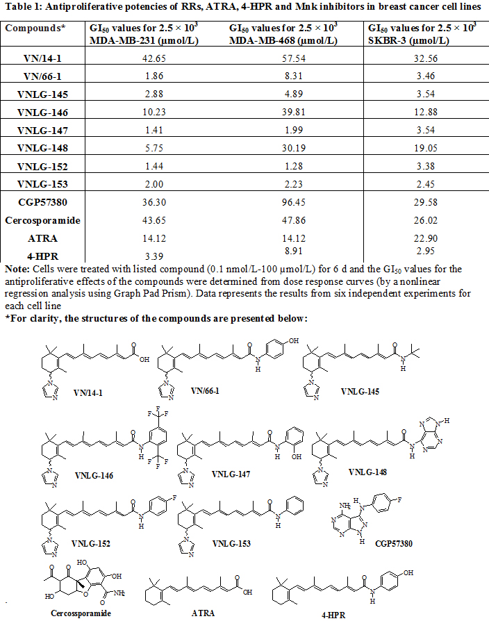 In conclusion, the data provided in this manuscript show that RRs degrade Mnk1 and block eIF4E phosphorylation to possibly promote cell death and inhibit cell growth, survival and invasion in breast cancer cells. To the best of our knowledge, ours is the first pre-clinical proof of evidence for agents capable of inducing Mnk1 degradation in cancer cells. Furthermore, we are unaware of any reported small-molecule Mnk degrading agents (MNKDAs) capable of inducing depletion of eIF4E phosphorylation and translational machinery. Reports from other laboratory have demonstrated that CGP57380 and cercosporamide block eIF4E phosphorylation by inhibiting Mnk activity rather than degrading Mnk [33, 34]. Significantly, unlike the Mnk inhibitors (CGP57380 and cercosporamide) and two clinically relevant retinoids (ATRA and 4-HPR) [35, 36], RRs show potent breast cancer cell growth inhibition and down-regulation of p-eIF4E. RRs mediated-Mnk1 degradation and inhibition of eIF4E phosphorylation observed in the present study is of significance considering the emerging attention in control of mRNA translation in general and the potent novel anticancer effects of Mnk degrading agents in particular. Our data support the notion that agents which degrade Mnk and block eIF4E mediated downstream events are likely to be superior to selective small molecule Mnk inhibitors such as cercosporamide and CGP57380 in the treatment of human cancers. Our data also highlight the potential utility of these compounds in investigating Mnk function compared to other commercially available Mnk inhibitors. Based on the well-established pharmacologic safety of the structurally related VN/66-1 synthesized previously by us [29] and 4-HPR [35], we envision that these new RRs will be nontoxic (safe) with excellent drug-like properties.