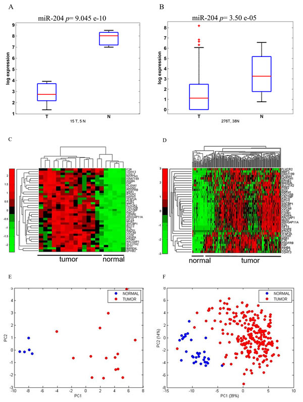 Figure 1: miR 204 and its target gene signature can discriminate between normal and tumoral gastric tissues. A.-B. Boxplots. Expression level of miR-204 in a discovery set of tumor (n = 15) and normal (n = 5) gastric tissues. Normalized expression levels as assessed by Quantitative PCR. B. Expression levels of miR204 in a validation set of 264 tumoral and 38 normal gastric sample tissues from the TGCA database. C.-D. Heatmap. Unsupervised hierarchical clustering of the levels of 37 genes targets anti-correlated with miR-204 expression and which contained a miR-204 seed sequence in 3’UTR region (see Table 1) in both the discovery set C. and in the TGCA dataset. Normalized intensity values reported. D. E-F. Principal Component Analysis (PCA) of the distribution of the 37 genes (as from 1C-1D) in the discovery set E. and in the TGCA dataset F. The first component (PC1) represents inter-group variability (x-axis) while the second component (PC2) represents the intra-group variability (y-axis).