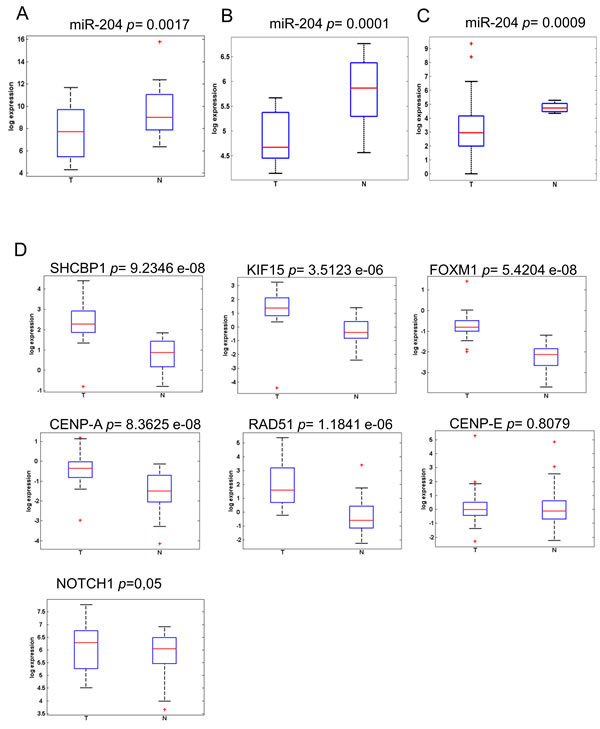 We choose to further study the expression of CENP-A, SHCBP-1, FOXM1, KIF15, in a cohort of 40 matched frozen tissue specimens (Table 1) (Figure 2A), previously characterized for the miR-204 levels (Supplementary Figure 2A). We observed that the expression of two out these four genes targets (FOXM1 and KIF15) significantly and positively correlated with the node (N) status of the patient (Supplementary Figure 2B). Next, we evaluated whether the higher levels of the representative genes examined would correlate with patient survival, by Kaplan-Meier analysis (KMplotter.com). This showed that the identified genes contributed prognostic potential, with higher expression of the gene correlating with decreased patient survival. This was true when analyzing both the 37 and the 7 genes signature (Figure 2B left and right panel, respectively).