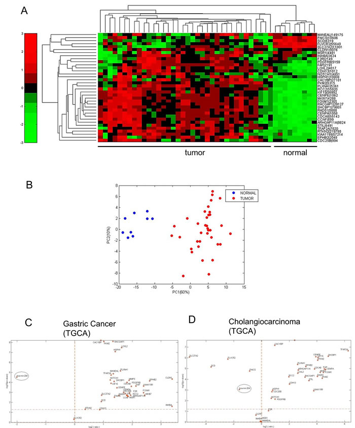 Signals from gene expression profiling were background adjusted and quantile normalized. A permutation test and a false discovery procedure were used to identify most deregulated genes between tumoral and normal samples, setting to 0.05 the level of significance. Principal component analysis and unsupervised hierarchical clustering were performed on deregulated features. Several prediction target tools were interrogated by using the web server tool MirWalk2 (http://zmf.umm.uni-heidelberg.de/apps/zmf/mirwalk2/) and the most predicted putative targets (at least four prediction software) of miR-204 selected to evaluate miRNA\mRNA correlation. A Pearson’s correlation coefficient and relative p-value were obtained for each miRNA-204\mRNA pairs, and genes with p-values less than 0.05 and absolute value coefficient higher than 0.7 were used for further analyses. The obtained signature was first validated in The Cancer Genome Atlas (TCGA) gastric adenocarcinoma and TCGA cholangiocarcinoma dataset, and only genes anti-correlated to miR-204 were selected. A restricted list of genes were further validated by RT-PCR. All the analyses were performed by Matlab (The MathWorks Inc.). For each box-plot shown outlier samples are indicated with asterisks. The survival analysis was performed using web server tool KM plotter. hght and low groups in KM Kaplan-Meier survival curves, was defined by median values of genes expression. Hazard ratio (HR), 95 % confidence intervals (CI), and log-rank p values are also indicated. Signal expression of the signature . aws defined by the mean intensity value.
