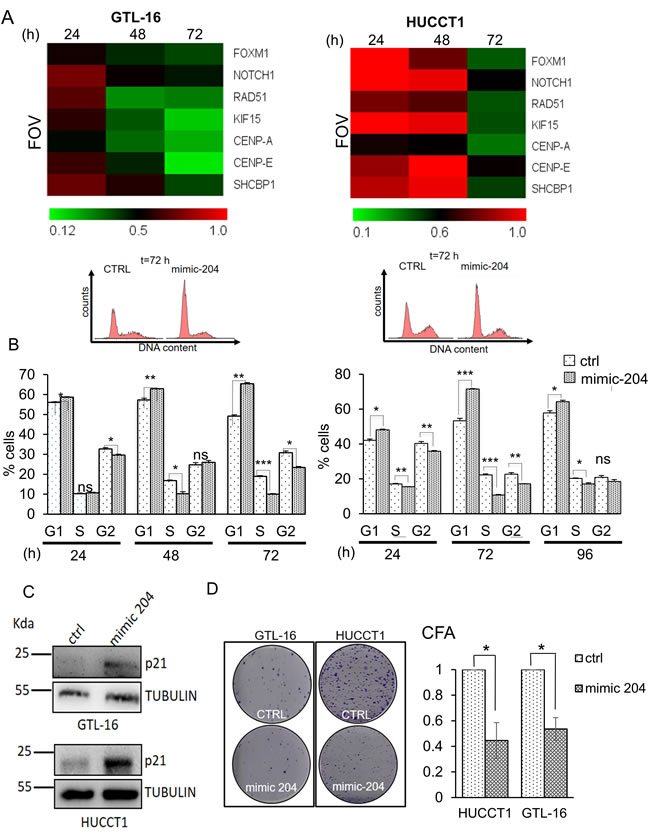 Next, we assessed whether manipulating the levels of the miR-204 gene targets in the GTL-16 and HUCCT1 cells, by means of transfecting mimic-204, could affect some of their protumorigenic properties. To this aim we performed clonogenic assays. This strategy revealed that the clonogenicity of the both cell lines was affected upon overexpression of the miR-204 mimic molecule as compared to the control-transfected cells (Figure 5D). These results are compatible with the previously mentioned involvement of most of the miR-204 candidate targets in the cell cycle control.