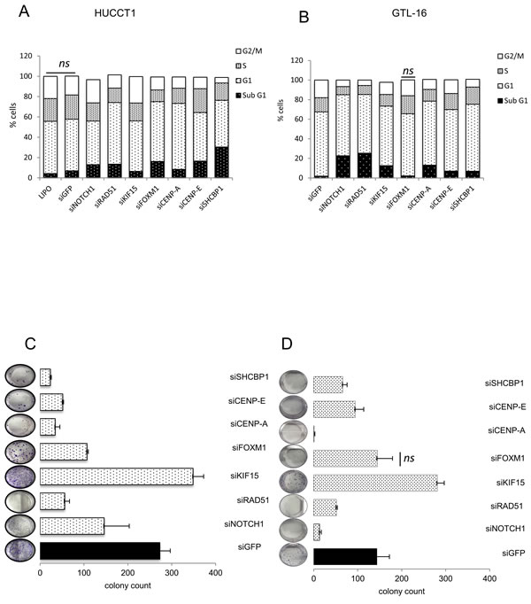 GTL-16 and HUCCT1 cells were transfected with siRNA of NOTCH1, RAD51, CENP-A, CENP-E, FOXM1, KIF15, SHCBP1 for 72 hrs using Lipofectamine RNAi MAX (Invitrogen) according to the manufacture’s instructions. siGFP was used as control. Effective silencing was assessed by qPCR (mRNA).