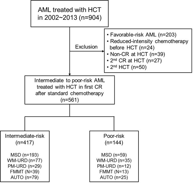 Figure 1: Consort diagram of analyzed patients in the current study. Abbreviation: AML, Acute myeloid leukemia; HCT, hematopoietic cell transplantation; CR, complete remission; MSD, matched sibling donor; WM-URD, well matched unrelated donor; PM-URD, partially matched unrelated donor; FMMT, familial mismatched transplantation; AUTO, autologous HCT