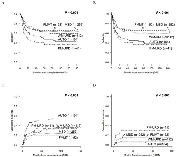 Engraftment was successful in all patients, except for 5 patients who died either from aplasia due to infectious complications or from sudden cardiac death. The median time to neutrophil-count recovery was 1 day faster in FMMT (11 days, range: 10-17) compared to AUTO (12 days, range: 7-78), MSD (12 days, 2-30), WM-URD (12 days, range: 6-29), and PM-URD (12 days, range: 10-21). The median time to platelet-count recovery was longer in MSD (15 days, range: 0-44) and PM-URD (13 days, range: 5-45) compared to FMMT (12 days, range: 0-21), AUTO (11 days, range: 0-123), and WM-URD (12 days, range: 0-50). However, after adjusting for pre-conditioning intensity and stem cell sources, recovery times were not significantly different between the donor types. Our data shows that ABO mismatch, sex mismatch, certain HLA locus mismatches between the donor and recipient, and stem cell source were not influential for either survival outcome or the incidence rate of acute and chronic GVHD. At the time of data analysis, 218 of the 561 patients had died, with 148 from leukemia relapse and 70 from other causes. The most common cause of death was pneumonia (n = 22) from variable causes - invasive aspergillosis (n = 6), Pneumocystis jirovecii pneumonia (n = 4), CMV pneumonia (n = 2), idiopathic (n = 10) - followed by acute gut GVHD (n = 11), veno-occlusive disease (n = 7), sepsis (n = 6), acute hepatic GVHD (n = 5), chronic lung GVHD (n = 5), thrombotic microangiopathy (n = 4), and hemorrhagic cystitis (n = 4), acute renal failure (n = 2), hepatitis B reactivation (n = 2), sudden cardiac death (n = 1), and lymphoma (n = 1). After a median follow-up duration of 58.7 months (range: 9.6-150.6), the 5-year overall survival (OS) of MSD, WM-URD, and FMMT was 63.1%, 63.9%, and 65.1%, respectively, while the rates for AUTO and PM-URD, 47.2% and 40.3%, respectively, were significantly inferior (Figure 2A). The disease-free survival (DFS) rate at 5 years was 61.4% for MSD, 62.1% for WM-URD, 65.3% for FMMT, 44.7% for AUTO, and 36.8% for PM-URD (Figure 2B). The 5-year cumulative incidence of relapse (CIR) rate was highest in AUTO (51.0%), followed by PM-URD (33.9%), WM-URD (30.3%), MSD (23.5%), and FMMT (18.5%) (Figure 2C). In contrast, the lowest 5-year non-relapse mortality (NRM) rate was identified in AUTO (3.8%), followed by WM-URD (7.4%), FMMT (15.7%), and MSD (15.6%). PM-URD showed the highest 5-year NRM rate at 29.3% (Figure 2D). Overall, MSD, WM-URD, and FMMT showed similar 5-year OS (63.1%) and DFS (62.0%) rates, which were significantly superior to AUTO (p = 0.006 and p < 0.001, respectively) and PM-URD (p < 0.001 and p < 0.001, respectively). PM-URD had a higher NRM rate compared to AUTO (p < 0.001), WM-URD (p < 0.001), FMMT (p = 0.079), and MSD (p = 0.043). Except for AUTO-HCT, the other donor types did not show significantly-different CIR rates (e.g., FMMT vs. PM-URD, p = 0.219).